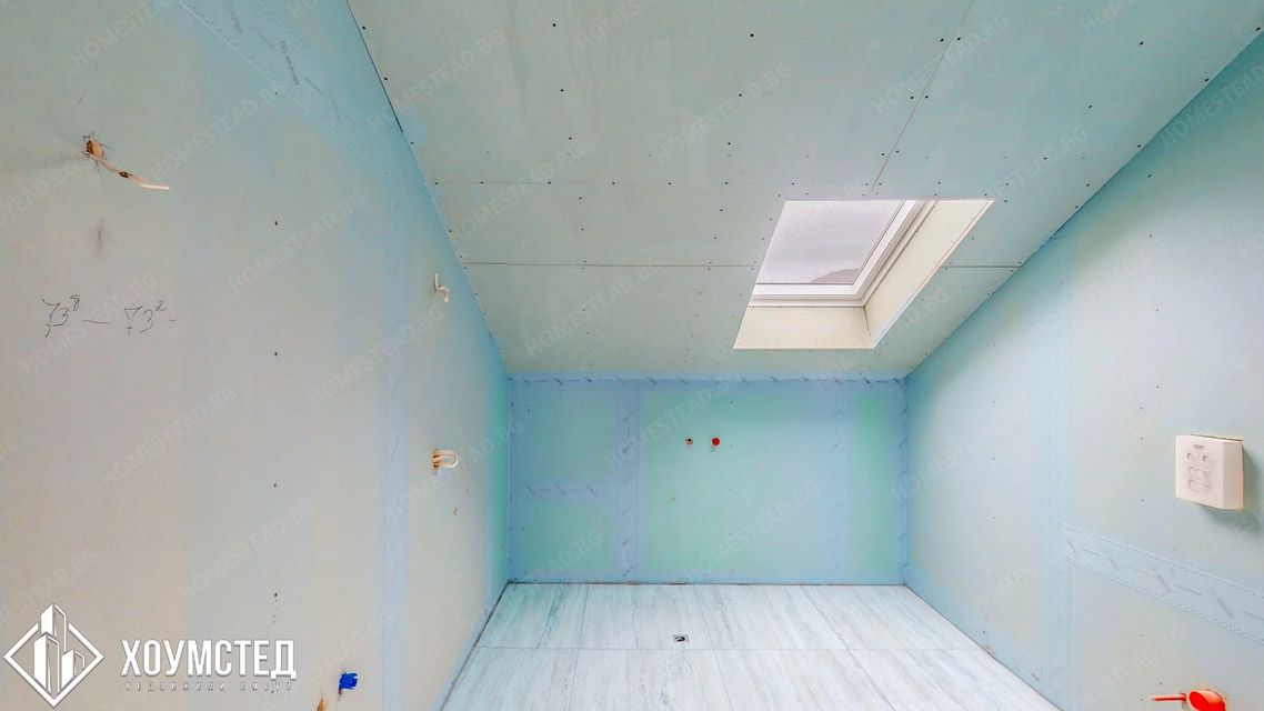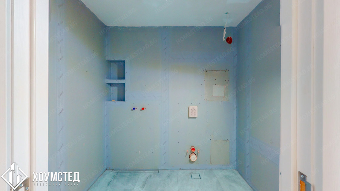 Стени: Обработени с хидроизолация на MAPEI, готови за полагане на фаянс/камък по ваш избор.