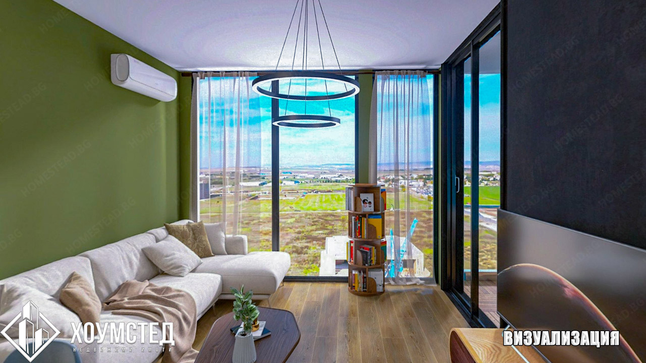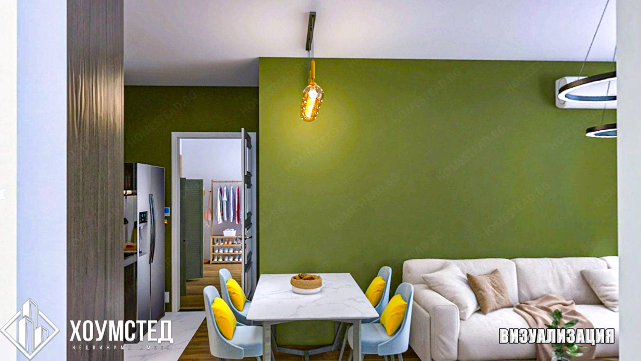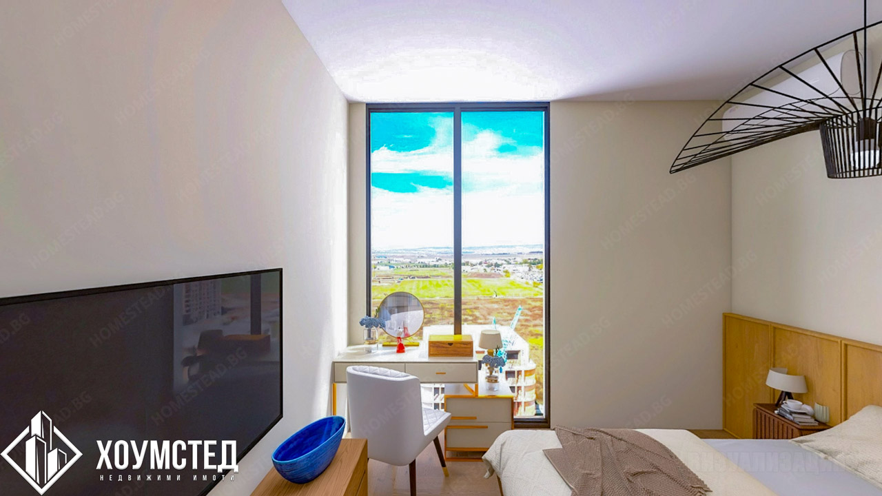 Към имота е изготвен цялостен интериорен дизайн от „Хоумстед“, представен чрез визуализации към обявата.